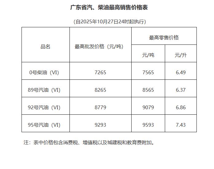 根据广东省发改委公布的最新消息,自2025年10月27日24时起,0号汽油参考价为6.49元/升。实际以加油站为准。